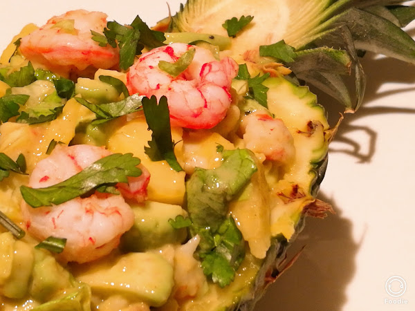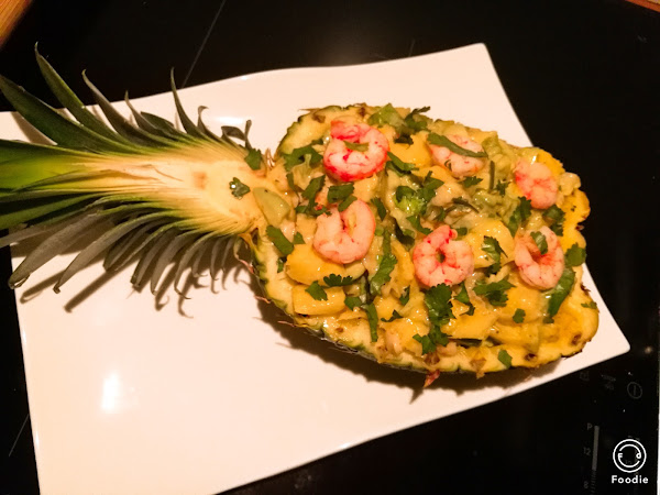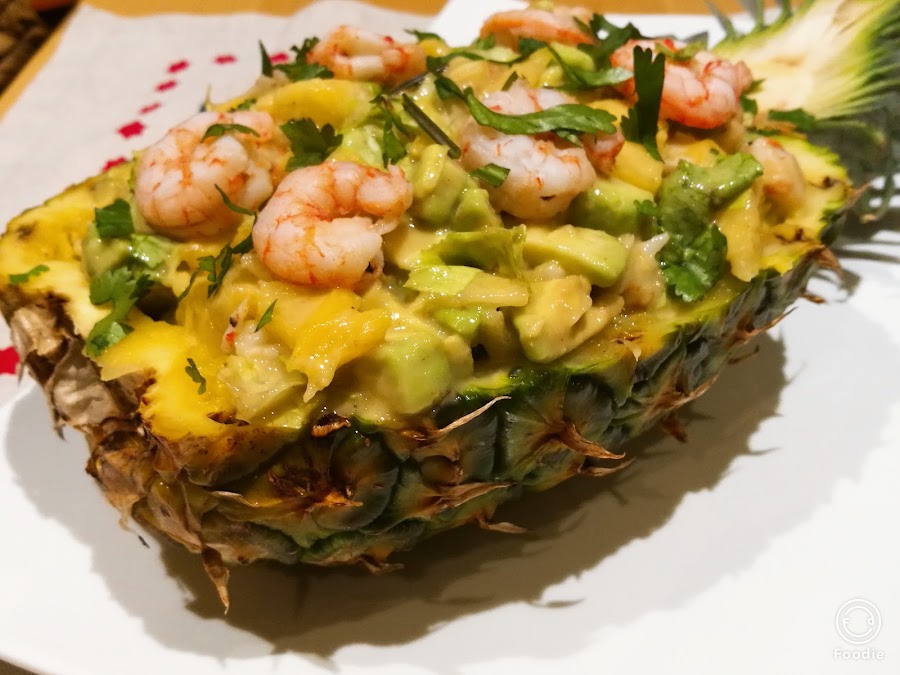 Esta vez los ingredientes son a nuestra elección, pero tenían que ser bien navideños!! Yo me decanté por piña y gambas, un entrante ligero que gusta a todo el mundo. La presentación dentro de la piña es preciosa, pero bien se puede preparar en vasitos individuales para más comodidad, y también queda genial. Vais a ver que facilita y rápida de hacer, vamos a por ella?