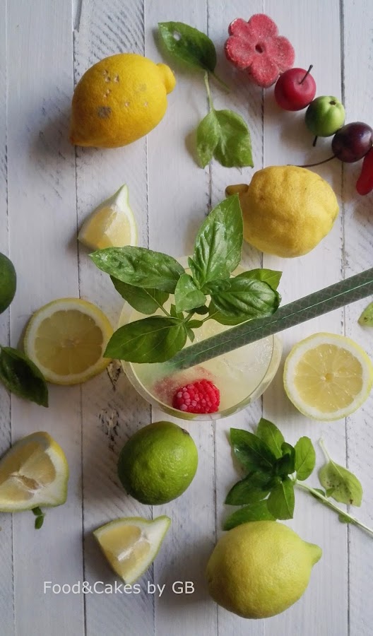 1- Ponemos en el vaso de la Thermomix 500 ml de agua mineral, el limón, la lima, la albahaca y los sobres de gaseosillas y aguantando el cubilete con la mano, programamos Turbo/2 segundos/1 vez.