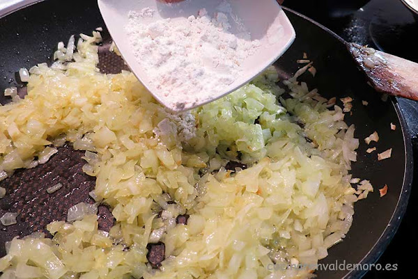 Después picamos la cebolla muy pequeña, la pochamos a fuego suave en la sartén y cuando este transparente, echamos una cucharada de harina y le damos unas vueltas.