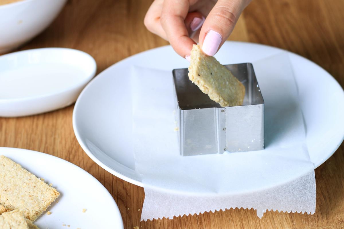 Estirar la masa de un espesor de 0,5 cm y cortar galletitas con un cortante cuadrado. Pueden poner fin arriba y abajo de la masa, para que no se pegue al palo o a la mesada sin necesidad de agregar harina.