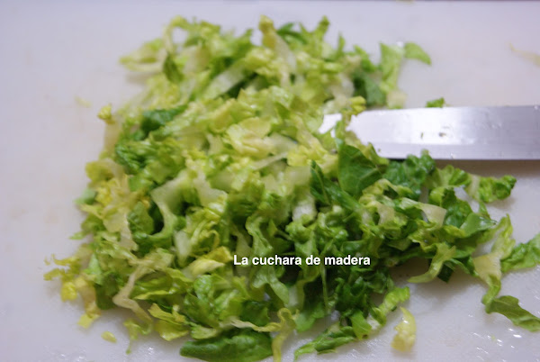Mientras se hacen los langostinos cortamos finamente la lechuga y la lavamos bien, escurrir y reservar.He usado un cogollo para los dos vasos.