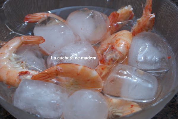 Retiramos los langostinos del fuego y los introducimos en un bol con bastante hielo para romper la cocción.