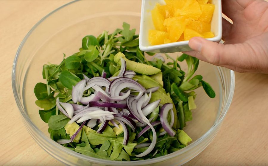 Comienza echando en un recipiente las lechugas, la naranja, el aguacate cortado en dados y la cebolla.