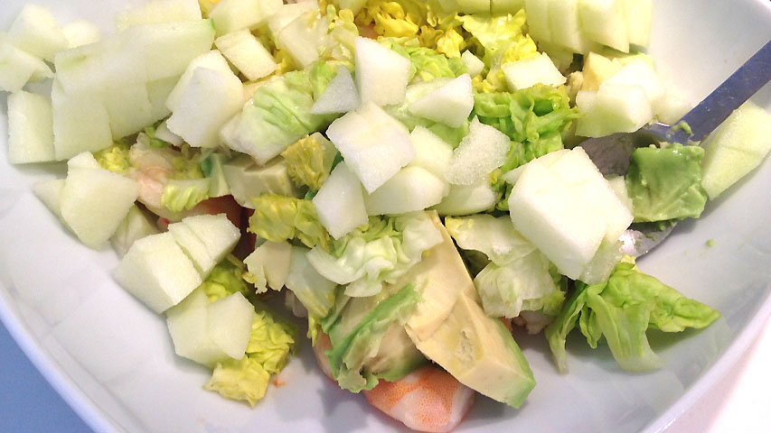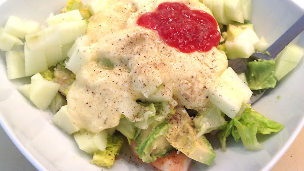 Añade al bol el aguacate troceado, la lechuga, la manzana (pelada y sin corazón), el ketchup, la salsa Perrins, sal, pimienta molida, zumo de limón y zumo de naranja (todo a tu gusto).