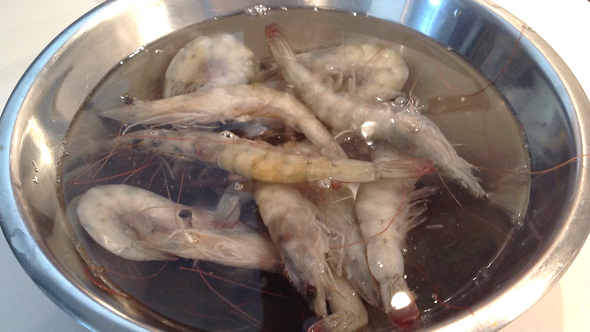 Descongela los langostinos en agua caliente.