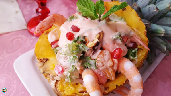 Hoy tengo un clásico de la cocina de la Navidad, piña rellena con langostinos y una rica ensalada con frutas de temporada. También conocido como cóctel de piña con langostinos en su propia piña.