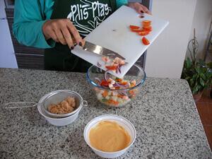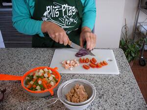 Para no olvidar nada, antes de empezar pon siempre todos los ingredientes a la vistaPon a escurrir la macedonia de verduras y el atún. Mientras, lava y corta a cuartos los tomates cherry. Pela y corta en finas láminas la cebolla. Corta los langostinos a trocitos, dejando uno por persona para decorar el plato final.