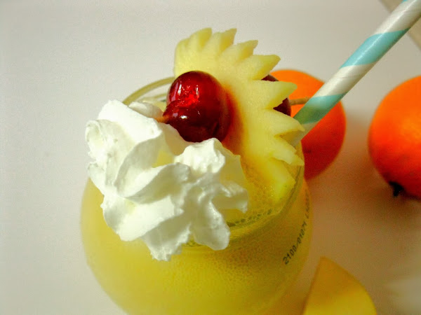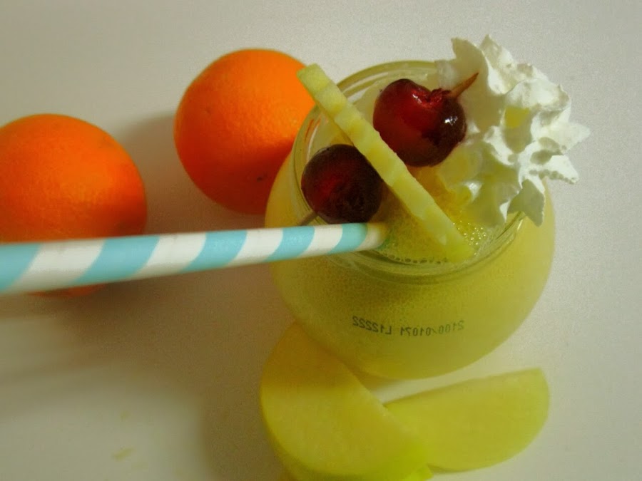 Poner los 5 ingredientes en la batidora batir sobre 10 o 15 segundos ponerlo en una copa decorar con una rodaja de manzana y las guindas o (al gusto) y poner un poco de nata (crema de leche) por encima y ya solo queda disfrutar....