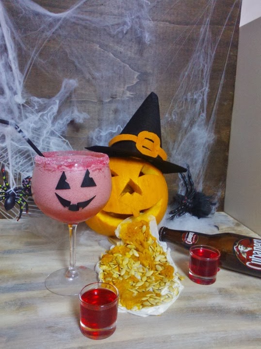 yo prepare la copa antes escarchandola con azucar Blanca y sirope de fresa y despues dejandola en el frigorifico para tenerla bien fria a la hora de beber este terrorifico coctel.