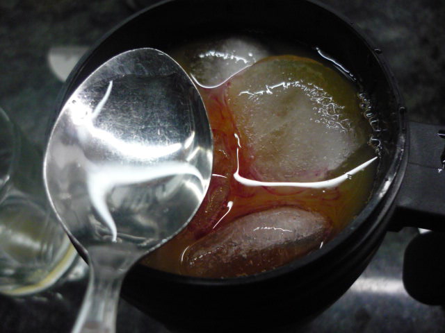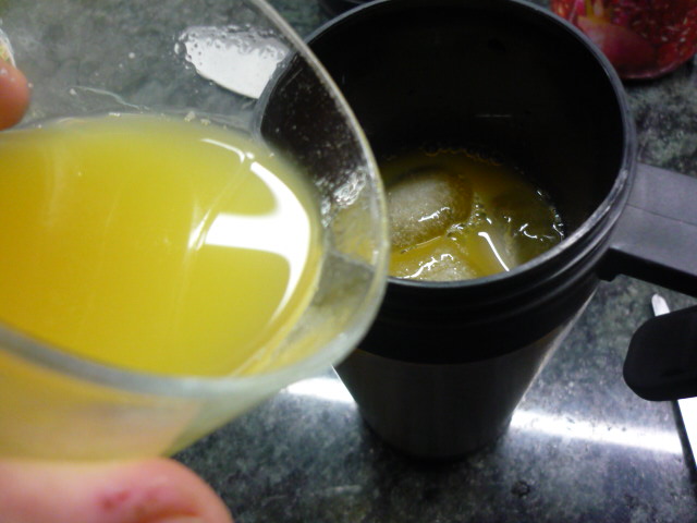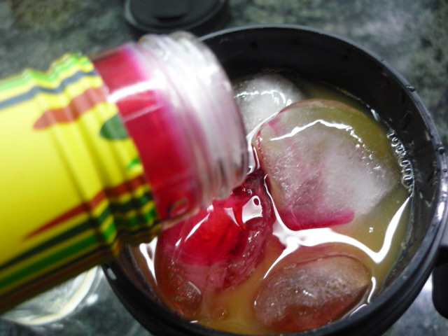 2.- Ponemos en la coctelera todo los zumos, el hielo, la granadina y una cucharadita de edulcorante o jarabe de azúcar. (yo utilicé zumos 100% natural y edulcorante para hacerlo más light)