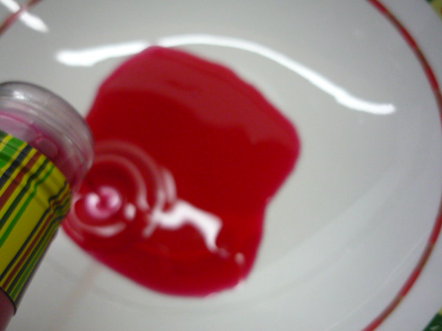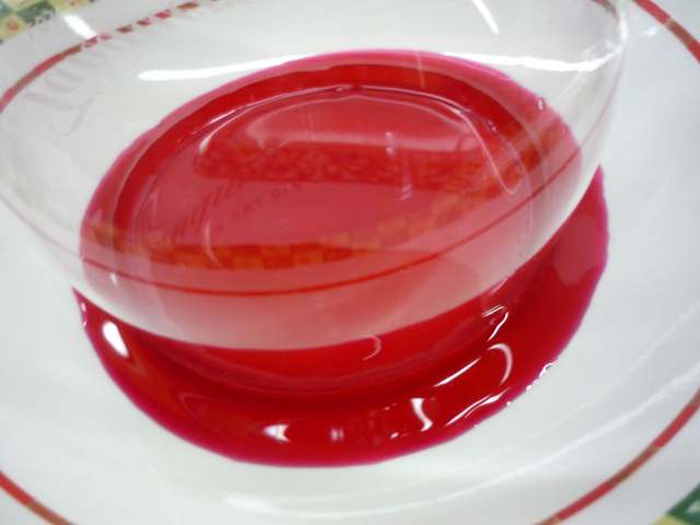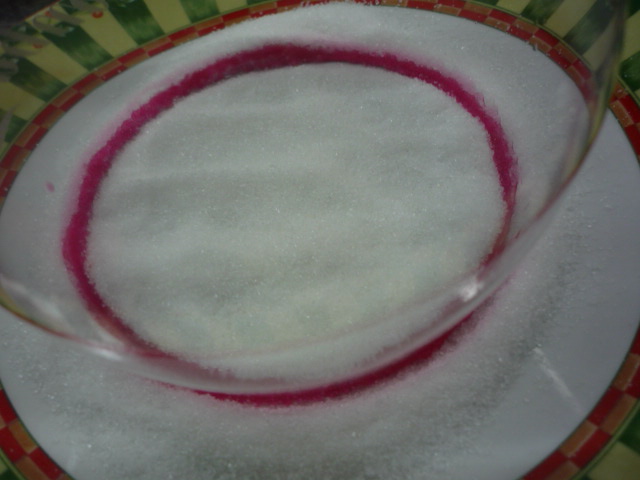 4.- Pasamos el borde del vaso o copa por el plato e granadina para que se impregne.