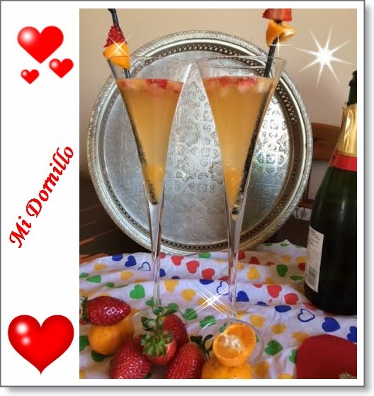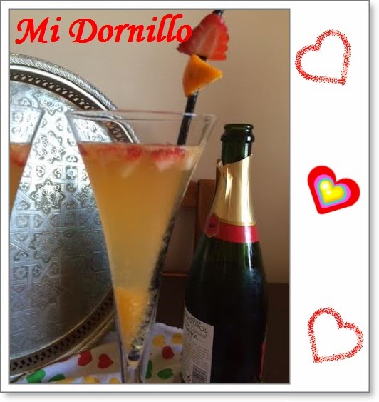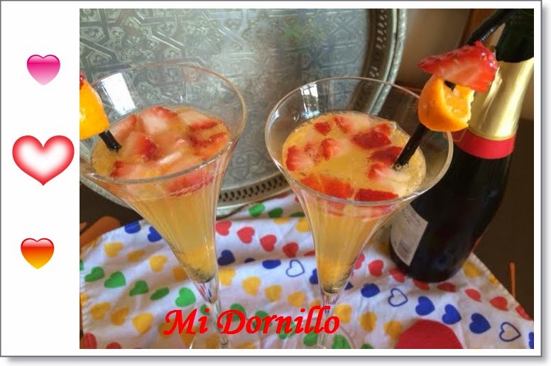 Ponemos media copa de cava, media de zumo de mandarina y una cucharadita de fresas picaditas, un gajo de mandarina o un cubito de zumo helado, adornar y servir inmediatamente.