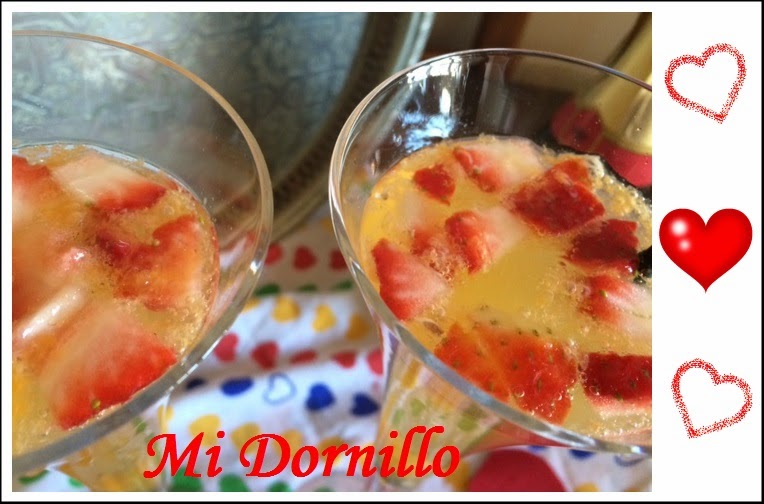 Limpiamos las fresas, y las maceramos en un poco de azúcar moreno, muy picaditas. Aparte hacemos el zumo de mandarina, un vaso grande. Podemos hacer un poco mas y meter en los cubitos de hielo, y hacerlos con zumo para enfriar aun mas la bebida y que no se caliente.