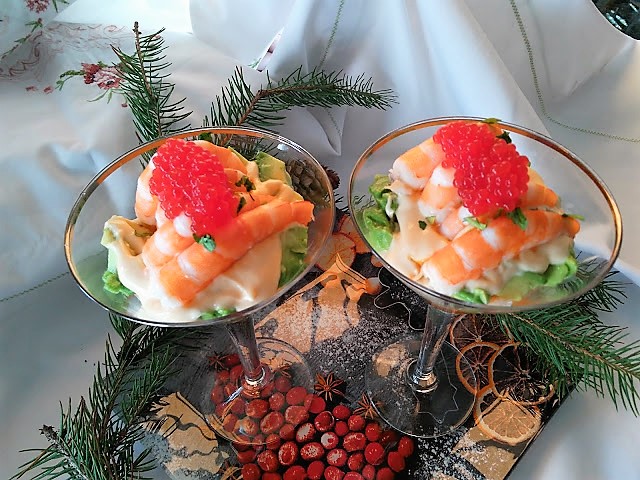 Montamos las copas, colocamos las capas: al fondo el kaki, a continuación coloca la mitad de los langostinos troceados y un poco de mayonesa de naranja encima de estos, después la mitad del aguacate, coloca de nuevo mayonesa de naranja y por último cuatro langostinos unidos unos a otros, pon un poco de perejil troceadito y corona con las huevas rojas.