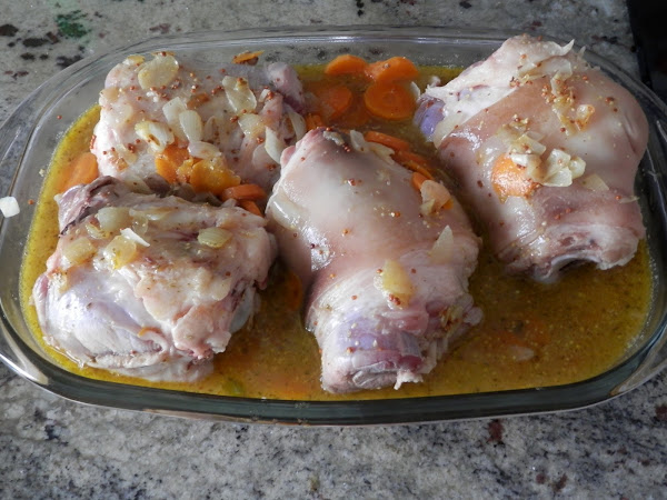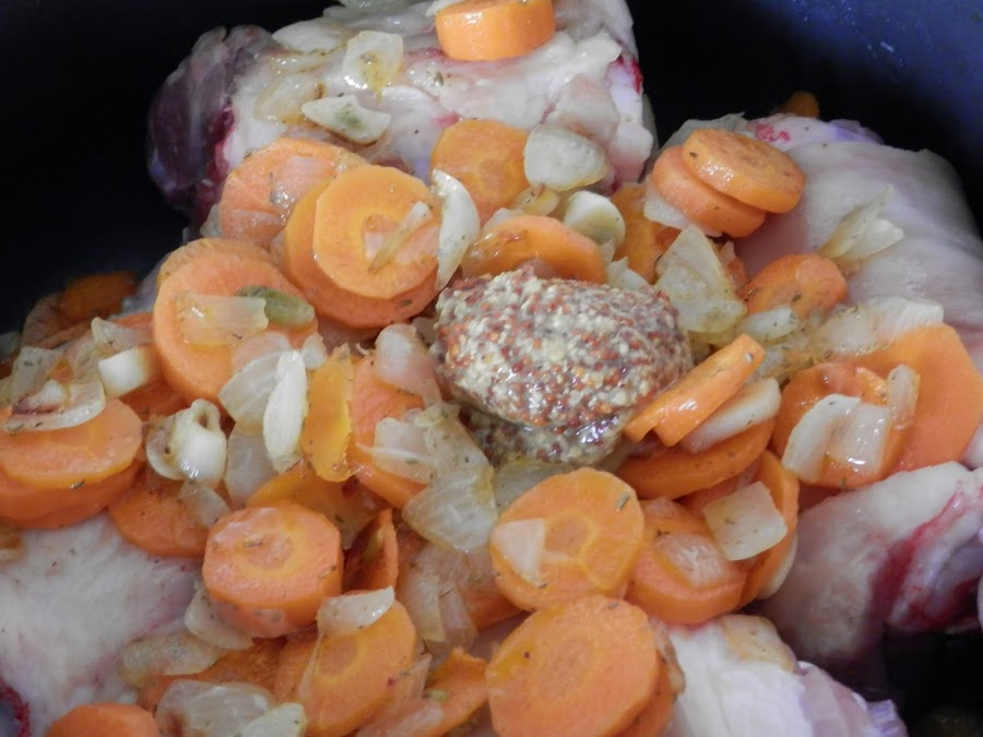 Añade la mostaza, la cerveza y cubre con agua hasta la mitad.