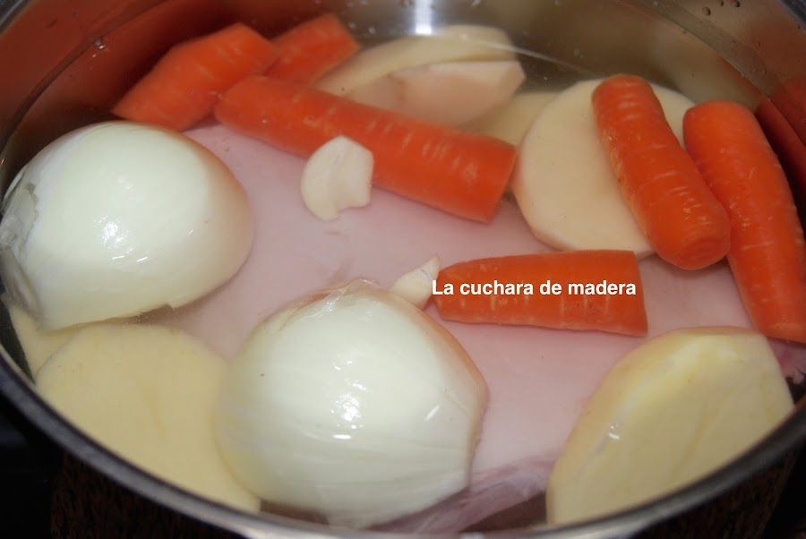 En una olla ponemos agua, el codillo, las papas peladas y cortadas, las zanahorias cortadas longitudinalmente, la cebolla pelada y partida en dos, los dientes de ajo pelados, los dos clavos, pimienta y sal. Dejamos que se hagan unos 15 a 20 minutos a fuego medio/alto