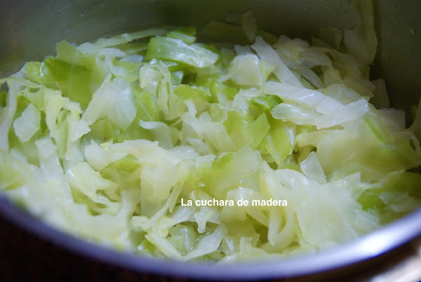Cortamos la col fina, la lavamos y la ponemos en un caldero pequeño con sal y la dejamos unos 10 minutos a fuego alto.Debe estar hecha pero crujiente. Reservamos.