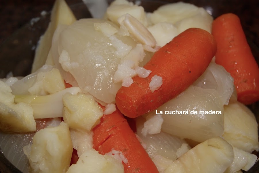 Retiramos las zanahorias, las papas, la cebolla y los ajos cuando ya estén blandos y reservamos.