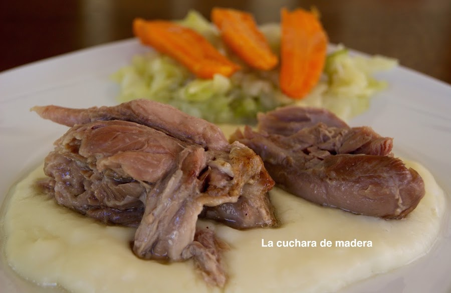 Presentación:En el centro del plato ponemos una capa ó cama de papilla, encima unos trozos de carne limpia del codillo; en un lado la col, sobre ella las zanahorias y un chorizo de aceite de oliva virgen encima.