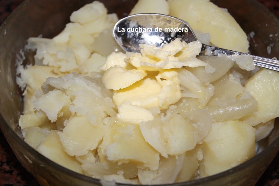 Mientras se hace nuestro codillo, en un bol ponemos las papas, la cebolla, los ajos, una cuchara pequeña de mantequilla y 5 cucharas grandes le leche.