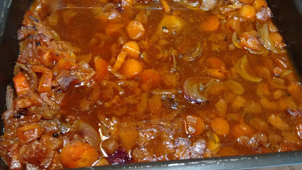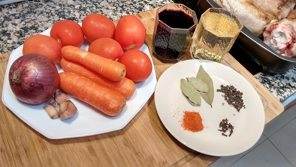 Dudaba entre hacer codillo al horno ó en salsa con la olla y decidí hacer algo mixto. Así que con la misma receta del Rabo de Toro he elaborado una especie de estofado de codillo al horno.