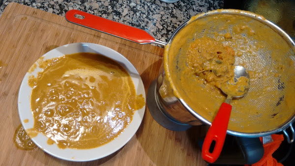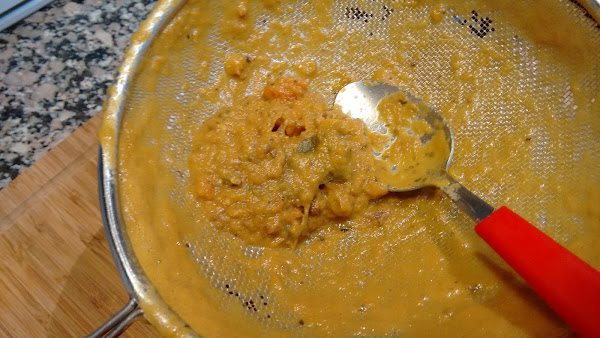 Lo pasamos por un colador fino con la ayuda de una cuchara, de esta manera dejamos la falsa fina y sin tropiezos.