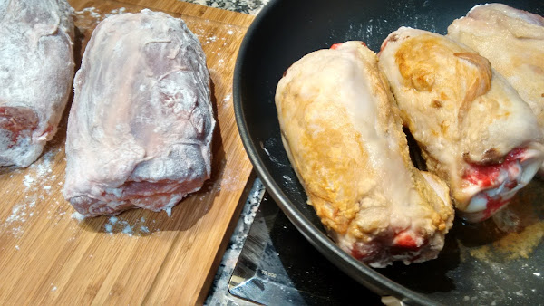 Salamos y enharinamos los codillos, los doramos en un choreón de aceite y colocamos en una bandeja para el horno.