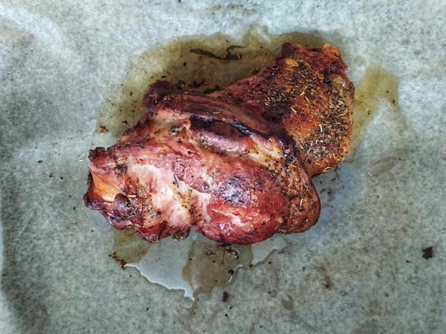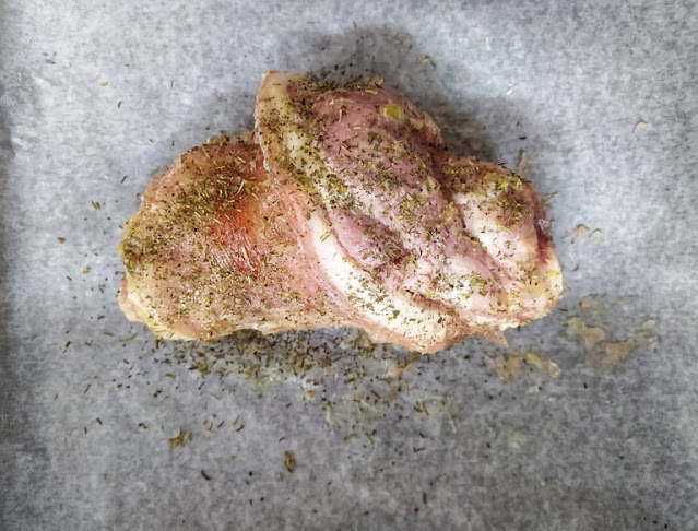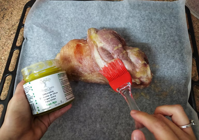 Ponemos el horno a precalentar, calor arriba y abajo con ventilador, temperatura 200ºC. Mientras se precalienta el horno, en la bandeja ponemos papel de hornear y el codillo de lacón. Con la sal líquida le damos varias pulsaciones por ambos lados, es muy cómoda y además se consigue el punto de sal perfecto. Con un pincel pintamos con la emulsión de aceite de oliva con ajo todo el codillo, así será más fácil no excedernos. Y por último, añadimos unas hierbas provenzales que además con la emulsión quedarán adheridas al codillo. Bajamos la temperatura del horno a 175 - 180 ºC e introducimos el codillo.