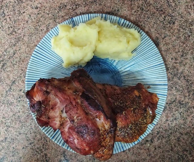 Mientras el codillo esté en el horno, le iremos dando la vuelta por cada lado para que se vaya haciendo bien. Según cada horno tardará mas o menos tiempo, pero aproximadamente tardó una media hora cuarenta minutos. Cuando esté bien hecho y la piel tostadita, lo sacamos y emplatamos con puré de patata, y listo para disfrutar.