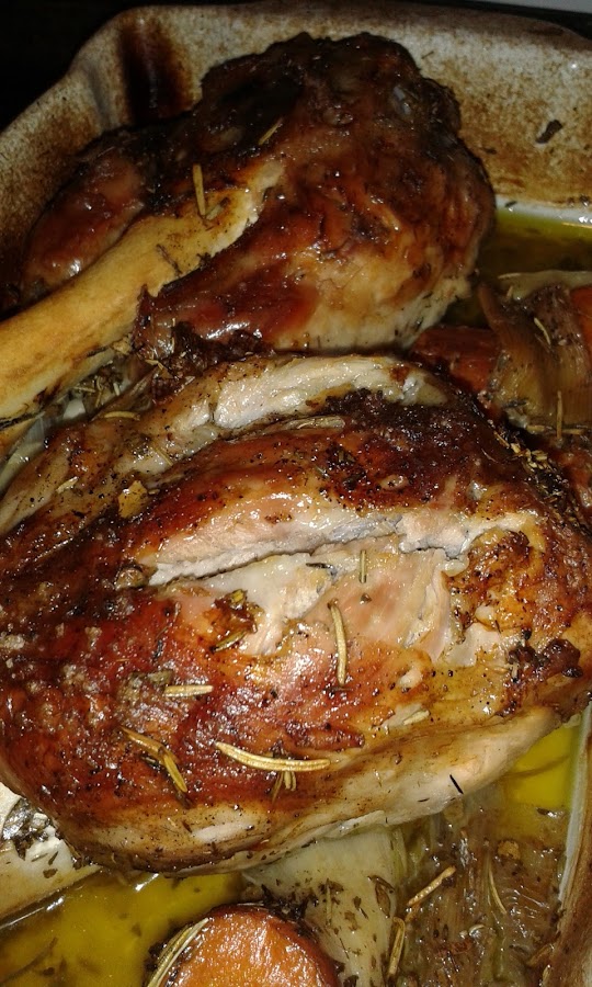 Luego lo he puesto en una fuente de horno con la verdura y le he echado romero, tomillo, laurel y vino.