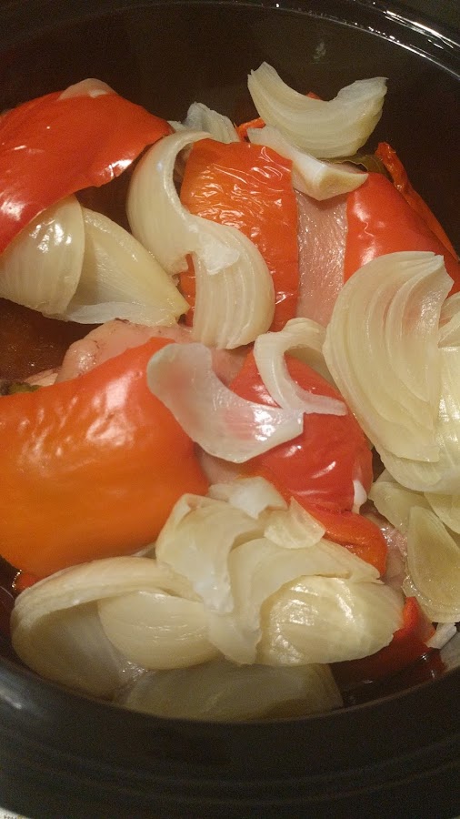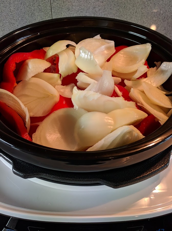 Programa menú al gusto, a 110 grados durante 3 horas y media. Al acabar saca los pimientos rojos (los resevas) y la cebolla