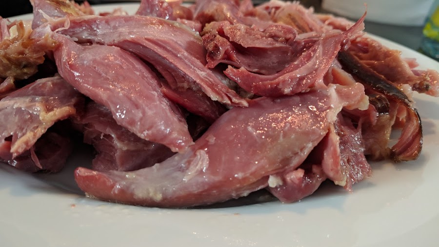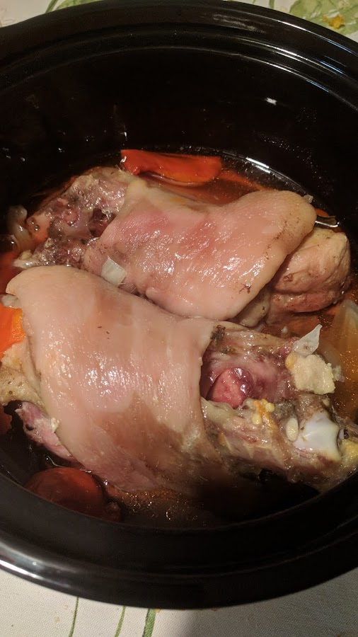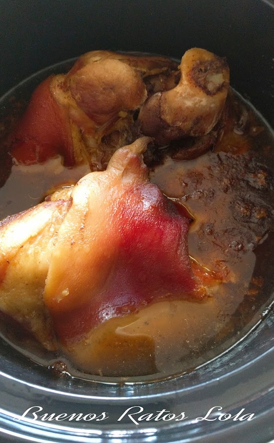 Pon la tapa y programa 4 horas y media en menú slow Cook. Acabado el tiempo saca los codillos, deja que se enfríen un poco y quita la piel y los huesos