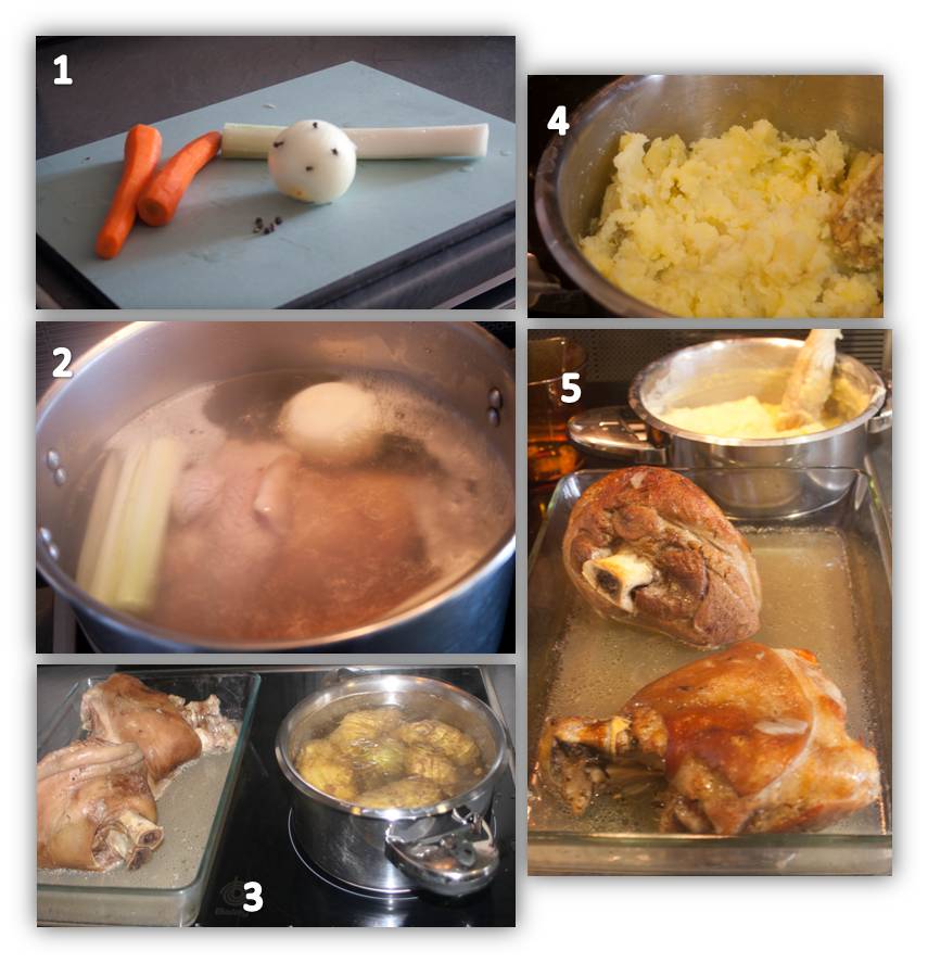 Mientras se cuecen los codillos, prepararemos las patatas para el puré. Las pondremos a cocer con su piel, en agua fría con sal, y cuando eche a hervir las dejaremos unos 30-40 minutos. Estarán cuando las pinchemos con un cuchillo o tenedor y al intentar levantarlas, no se queden clavadas, sino que resbalen.