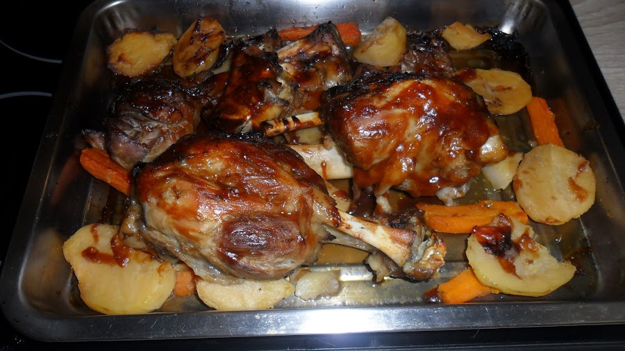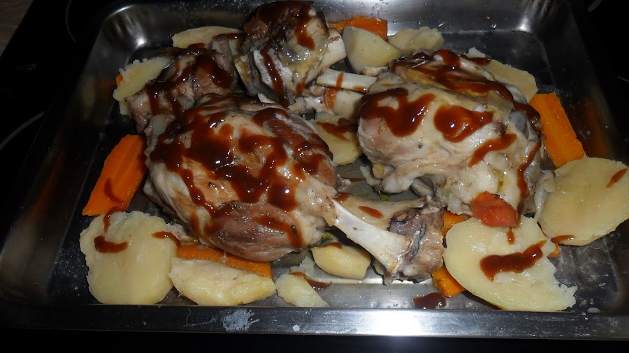 En una fuente de horno, poner una cama de cebolla y las patatas a trozos o rodajas, zanahorias el vino y coñak y los codillos.Espolvoreamos con las especias, sal, un chorrito de aceite de oliva y un chorrito por encima de salsa barbacoa en mi caso.Es opcional.Regamos con el caldo colado de la cocción hasta que las patatas estén tiernas , reducir el caldo y ver como el codillo va dorandose y este a nuestro gusto.