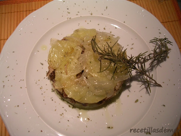 Con un molde ponemos primero una capa de patata, luego una de carne y de nuevo otra de patata. Retiramos el anillo y listo. A que ha quedado estupendo? Pues esta buenísimo.