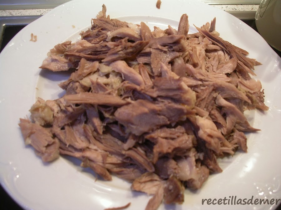 Con el codillo ya frio, lo desmenuzamos y lo vamos colocando en un plato.