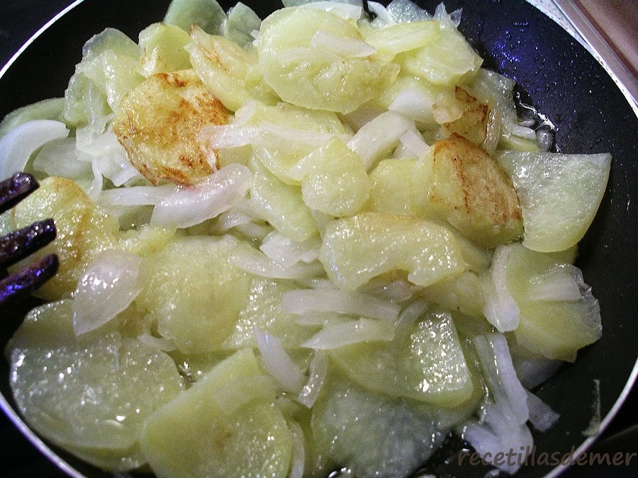 Pelar las patatas y cortarlas en rodajas para hacer las patatas panadera. Cortar la cebolla finamente en juliana. En una sartén poner a pochar la cebolla junto con las patatas. Cuando este mas o menos hecha retirar.