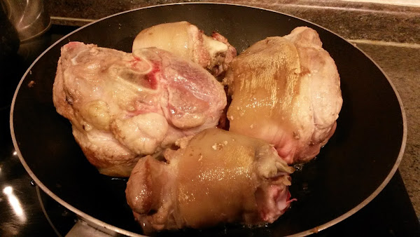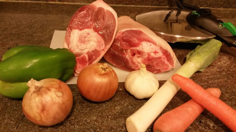 dos codillos de cerdo partidos por la mitad (estos pesaban alrededor de un 800 gr. cada uno)una cebolla grande