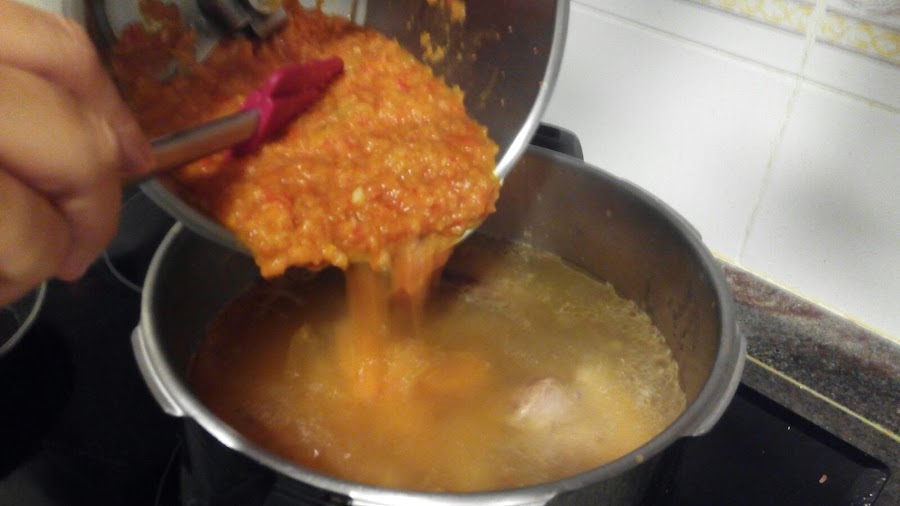 5.- Volcamos ahora la salsa de las verduras. Si no queréis que se noten los trocitos, antes de ponerlo en la olla rápida, triturar un poco más las verduras (a vuestro gusto). Yo no las trituré.