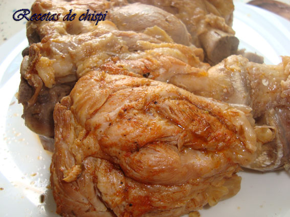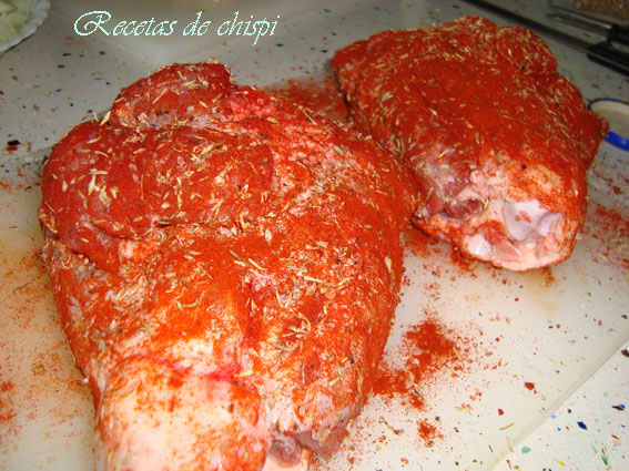 Poner sal y pimienta a los codillos, embadurnar de pimentón y tomillo, apretar con las manos para que se quede todo más pegado.