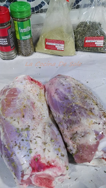 Lo primero que hacemos es salpimentar los codillos, y espolvorearlos con el romero, el tomillo y la Pebrella.