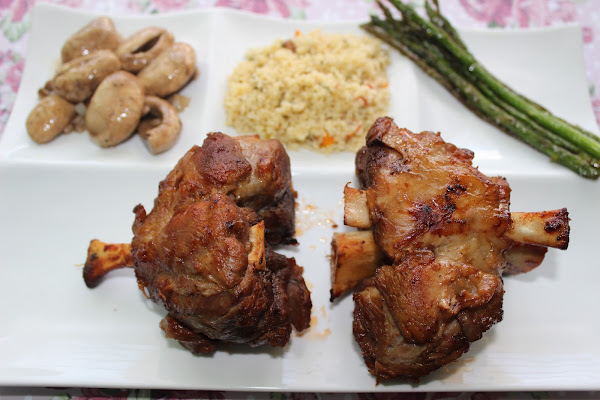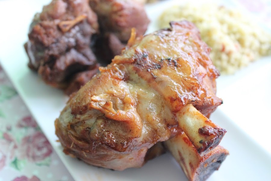 Unte con esa salsa cada codillo por todos los lados y los deje reposar toda la noche en la nevera. Cuando los saque, un par de horas antes de meterlos al horno habían cambiado de color y la piel estaba totalmente impregnada con los sabores del glaseado.