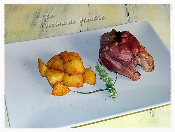 Mientra esto se cocina preparar las patatas de guarnición, pelar y cortar en octavos, poner en un bol con una pizca de sal y un poco de tomillo, mezclar y dorar en abundante aceite, cuando estén bien doradas escurrir bien el exceso de aceite y reservar.