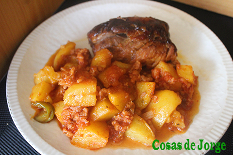 Rebuscando en los confines del congelador de casa, encontré un codillo pre-cocido y una tarrina de sofrito, que uniéndolo a una guindilla y unas patatas salieron dos platos tan ricos como el de la foto.