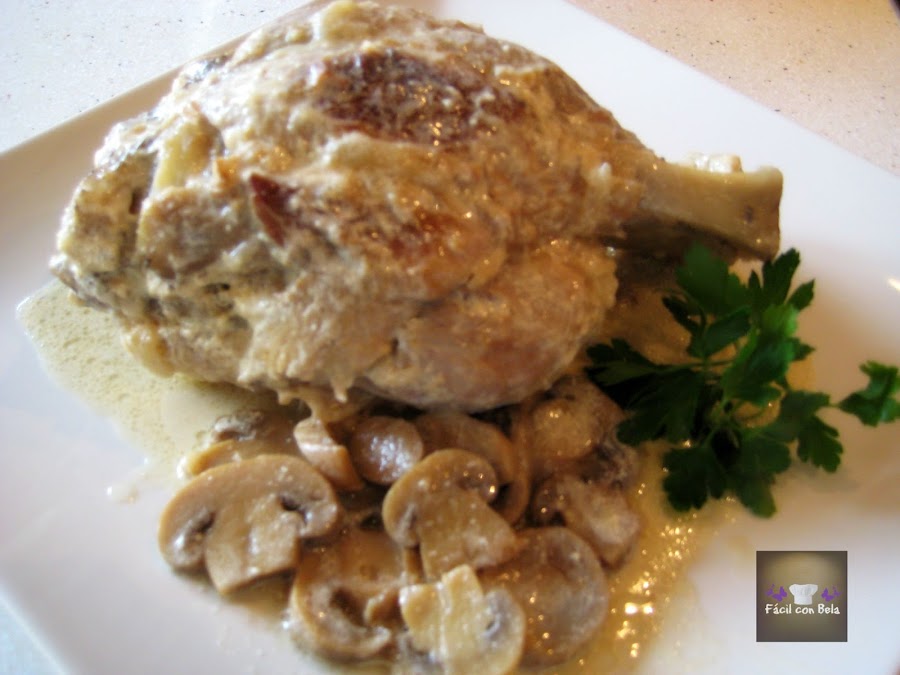 6. Cuando pinchemos y la carne este blanda, le echamos la nata (crema de leche) y al cabo de 5min los champiñones dejaremos hacer entre 5 a 10 minutos a fuego lento. Para que se fusionen los distintos sabores y que los champiñones estén tiernos.