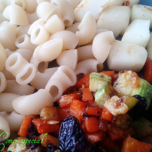 ELABORACIÓN: Guisar con agua, sal, una cucharada pequeña de aceite y orégano los coditos, proceder según las indicaciones del paquete. Cortar en trozos las verduras, poner una sartén con un poco de aceite (una cuchara pequeña), pochar la cebolla y los ajos. Últimamente prefiero poner la cebolla y luego añadir el ajo porque enseguida coge color. Ese será el momento preciso para añadir la zanahoria, en cuanto el ajo adquiere un poco de color. A los cinco minutos, pondremos el calabacín y las pasas. Aderezar con lo que más apetezca, por ejemplo: sal, ajo molido, cebolla molida, orégano y romero. Bajar el fuego y dejar que llegue al punto que os apetezca, al dente o bien hecha. Antes de montar el plato, daremos un golpe de calor a los restos de calamar y listo. ¡A comer!
