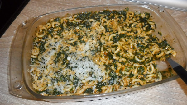 Por otro lado, en una cucharadita de aceite pochamos las espinacas cortaditas y dejamos hasta que estén tiernas pero sin pasarnos.Las agregamos al guiso y dejamos el conjunto cinco minutos mas. Servimos acompañado de queso de gratinar el que mas nos guste. Podemos, en el momento de servir darle un golpe de gratinado.