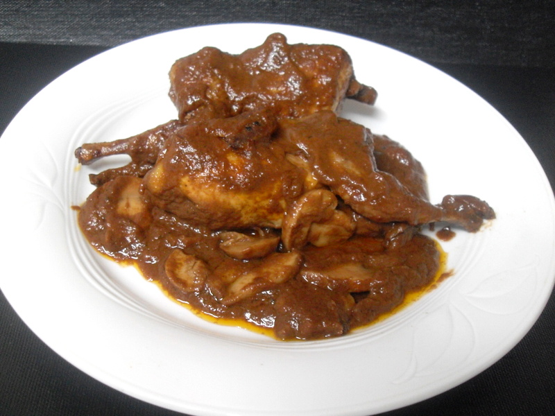 Pasado el tiempo de cocción, retirar las codornices con cuidado, quitar las hierbas y triturar la salsa. Pasar de nuevo la salsa a la cazuela y ponerla a calentar, agregar la onza de chocolate negro, mezclar para su completa disolución y que quede bien ligada la salsa. volver a poner las codornices y cocer 10 minutos más.