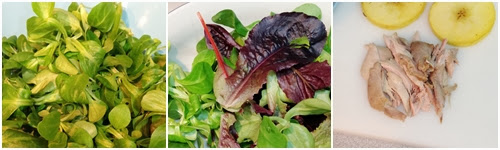 Para la ensalada: 1 manzana golden, canónigos y brotes variados.