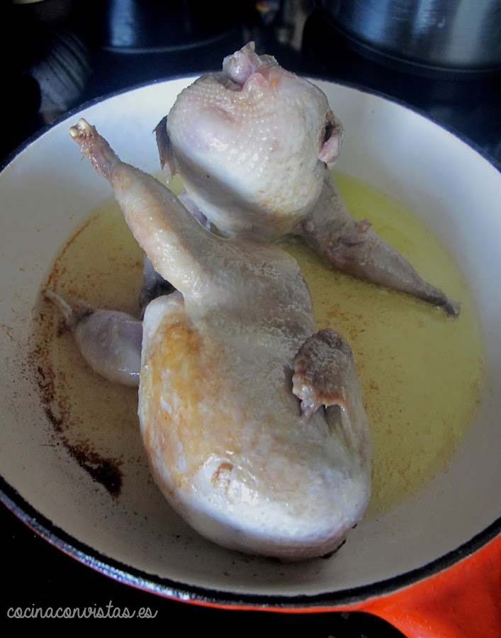 Salpimentamos las codornices y las doramos en aceite. Cuando estén listas las retiramos de la sartén y las reservamos.
